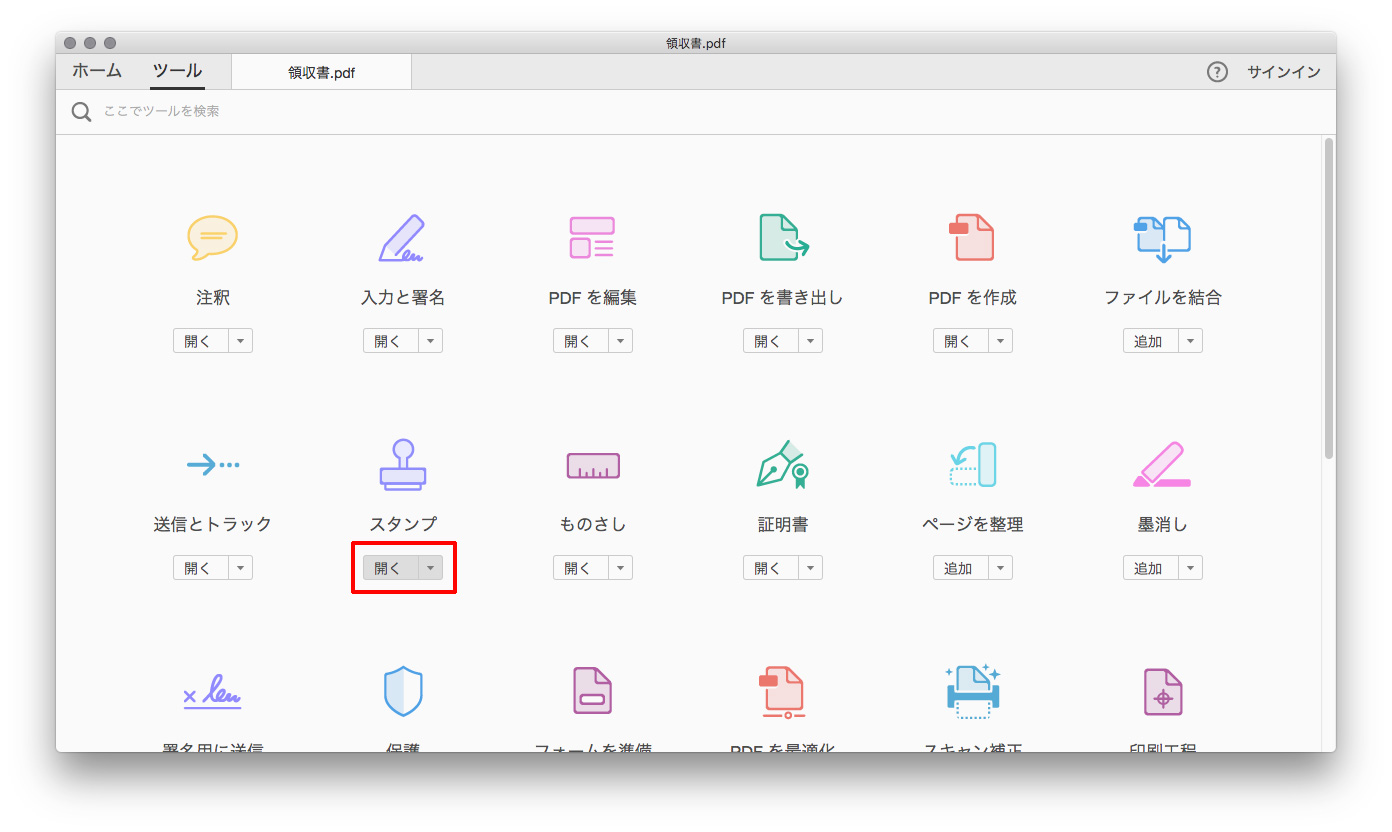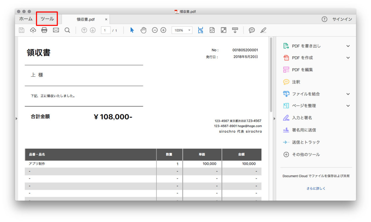 領収書の PDF ファイルを Adobe Reader で開き、ツールタブ をクリックします。(領収書の PDF データは作成済みを前提としています)