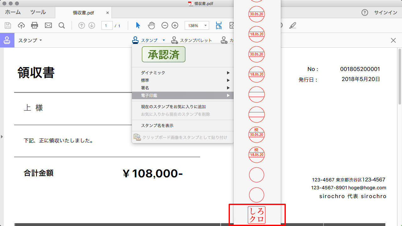 「スタンプ」から上記の分類「電子印鑑」を選択すると、先ほど作成したスタンプがあるので選択します。