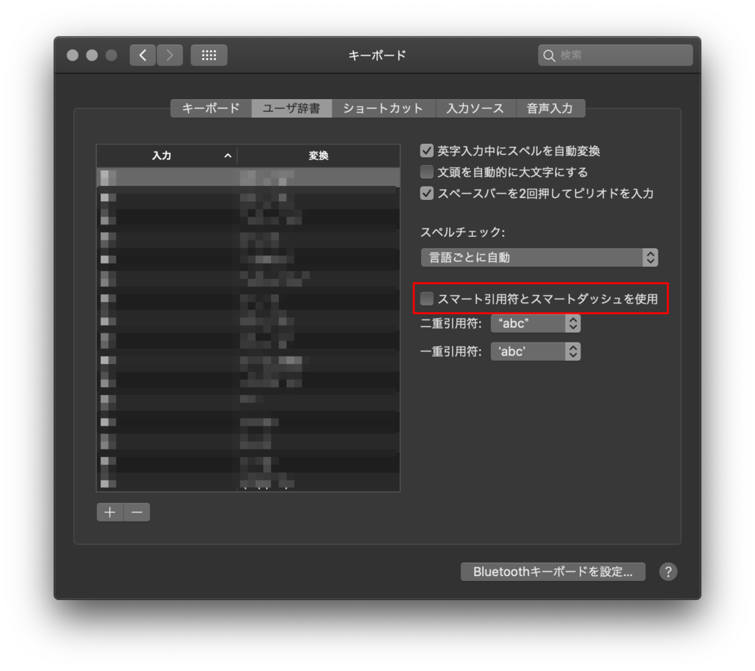 システム環境設定 > キーボード > ユーザ辞書 より「スマート引用符とスマートダッシュを使用」を OFF にします。
