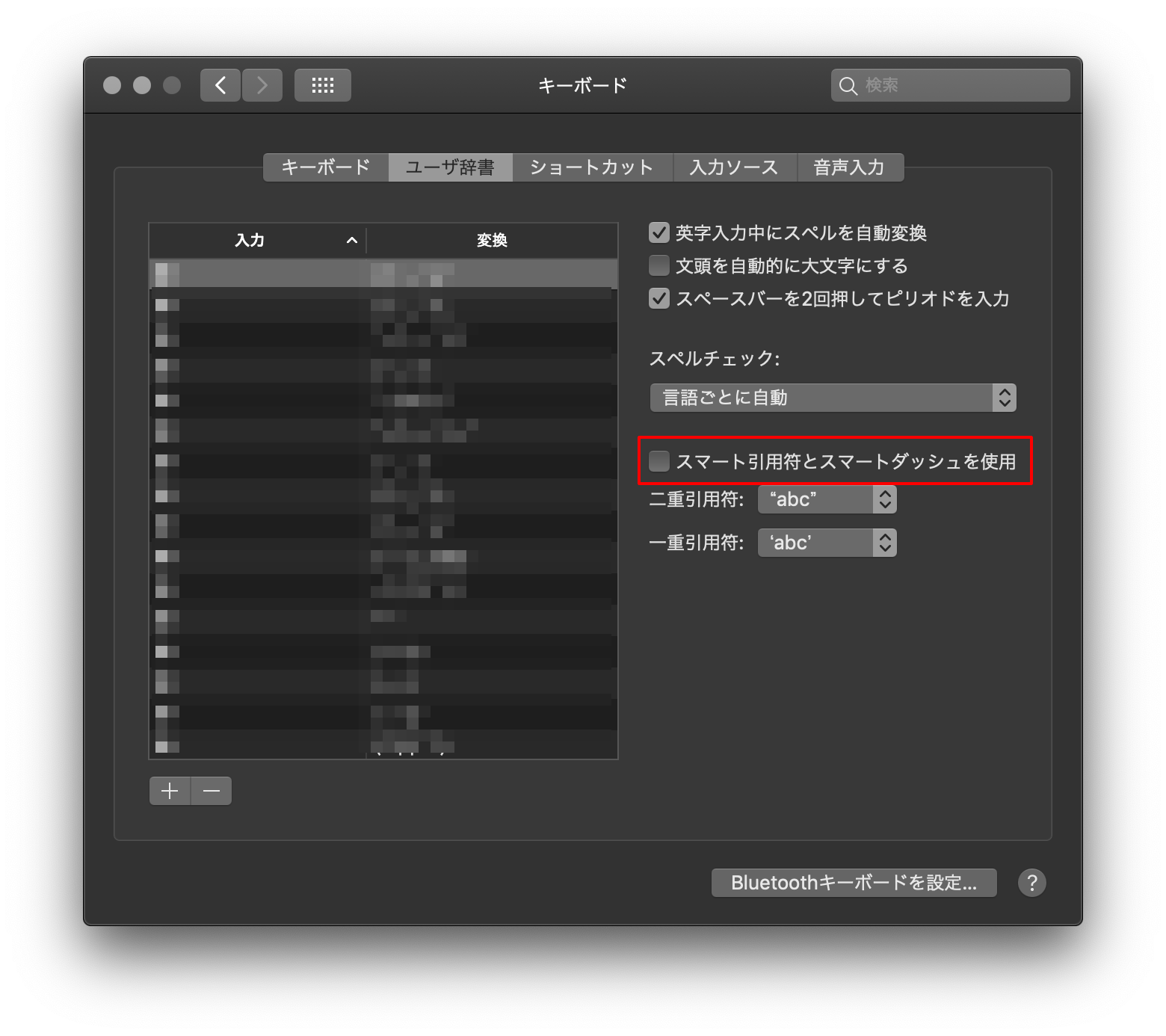 システム環境設定 > キーボード > ユーザ辞書 より「スマート引用符とスマートダッシュを使用」を OFF にします。