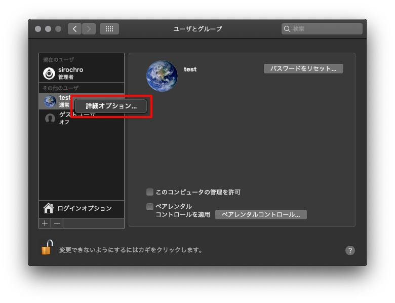 - アカウント名、ホームディレクトリ名を変更したいユーザを 右クリック -> 詳細オプションメニュー表示